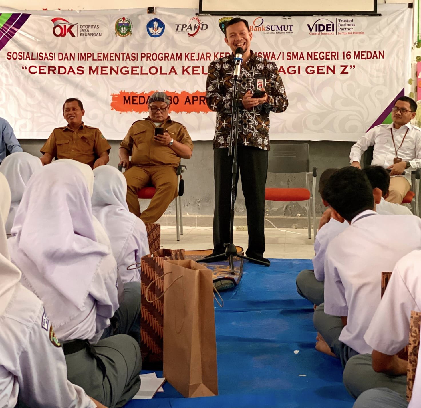 Hadir pada kesempatan ini para mitra pendukung yang menjadi narasumber dari PT Bank Pembangunan Daerah Sumatera Utara, dan Asuransi Umum Videi. Acara yang dibuka oleh Deputi Direktur Pengawasan Perilaku PUJK, Edukasi dan Perlindungan Konsumen Yovvi Sukandar, turut dihadiri oleh Wakil Kepala Sekolah Bidang Kesiswaan Suyono, S.Ag, Mpd, Wakil Kepala Sekolah Bidang Kurikulum Raja Daulay S.Pd, para guru dan 150 Siswa SMA Negeri 16 Medan.