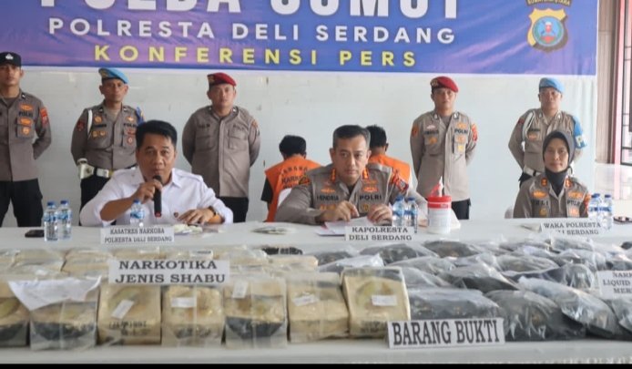Polresta Deliserdang, perlihatkan barang bukti puluhan kilogram narkoba, Senin (27/4/2026). [Ist]