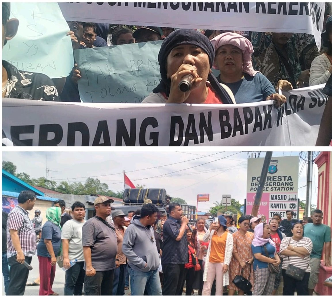 DELI SERDANG (HARIANSTAR.COM) – Puluhan warga Kecamatan STM Hilir bersama LSM Perisai Keadilan Nasional (PKN) dan didampingi LBH Farid Faturahman, SH., MH., menggelar aksi damai di depan Mako Polresta Deli Serdang, Kamis (30/10/2025) sekitar pukul 10.00 WIB.
