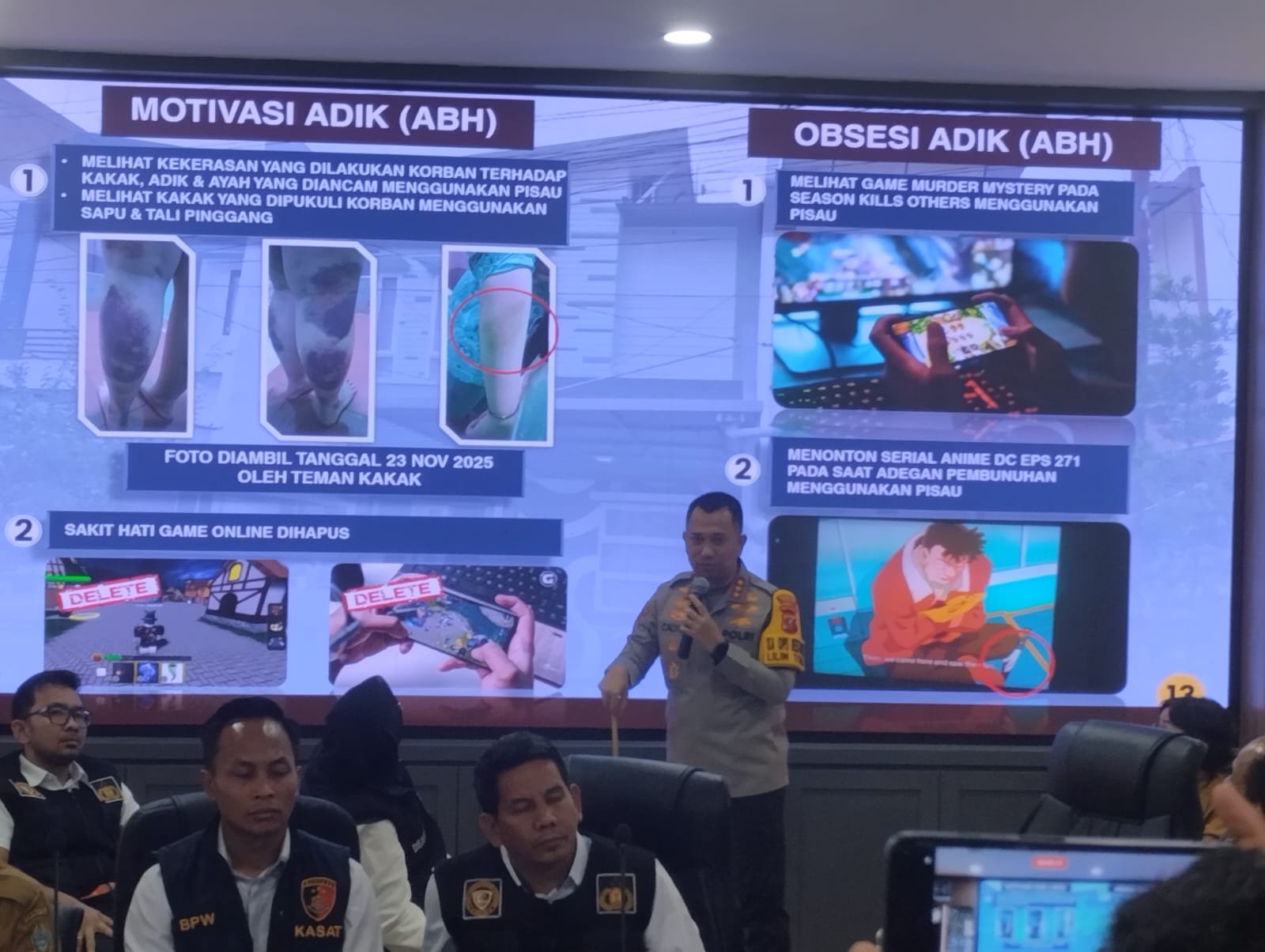 “Tersangka menghabisi nyawa ibunya dengan menggunakan pisau karena terobsesi dengan game murder mistery pada session Kills others yang menggunakan pisau. Serta menonton serial anime DC episode 271 saat adegan pembunuhan menggunakan pisau. Si adik (pelaku) menikam ibunya dengan 26 kal tusukan di tubuh,” jelasnya.