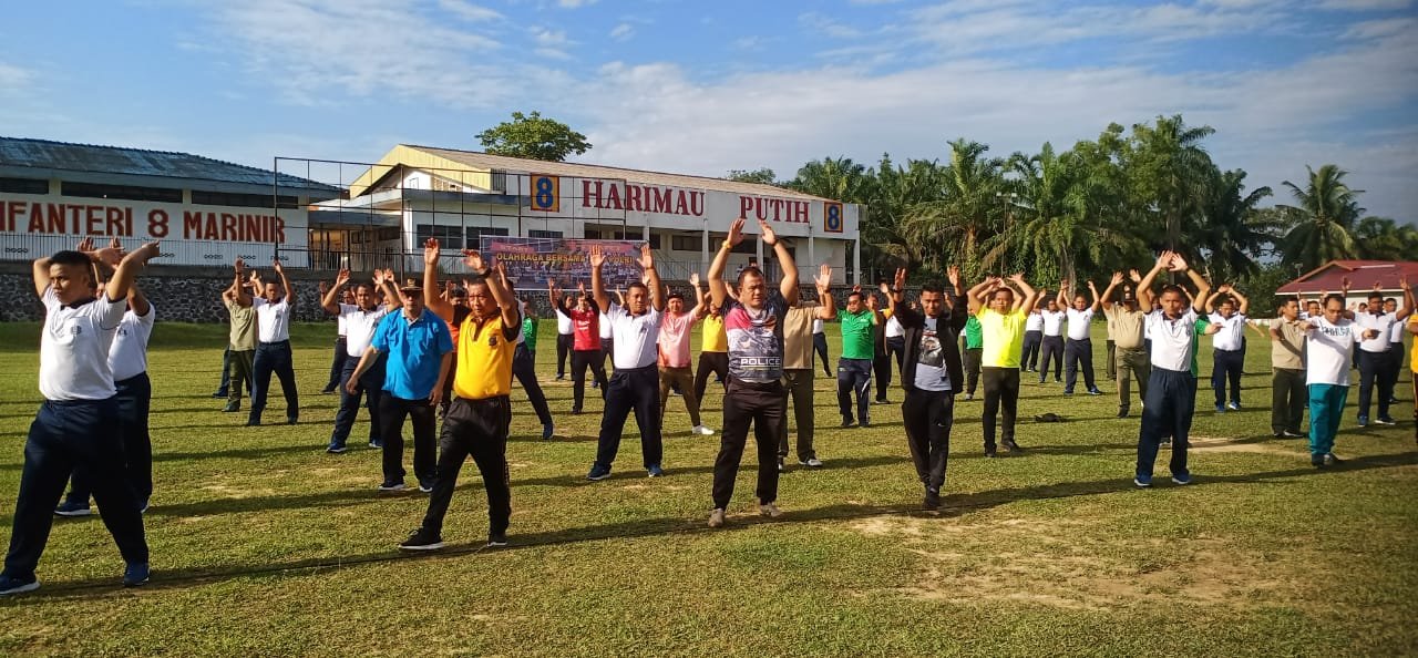 Kegiatan olah raga bersama TNI-Polri dengan peserta olah raga senam bersama TNI-Polri dilapangan bola kaki Kesatriaan Yonif-8 Marinir Harimau Putih.
