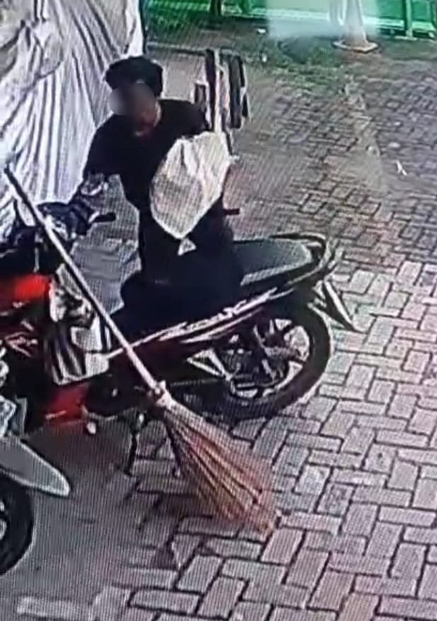 Dari rekaman cctv, seorang pria terlihat memasuki pekarangan Masjid membawa sebuah karung. Pria berkaos hitam itu sempat beberapa detik memperhatikan situasi. Merasa aman, pria itu langsung membawa kabur sepeda motor itu tanpa kesulitan.