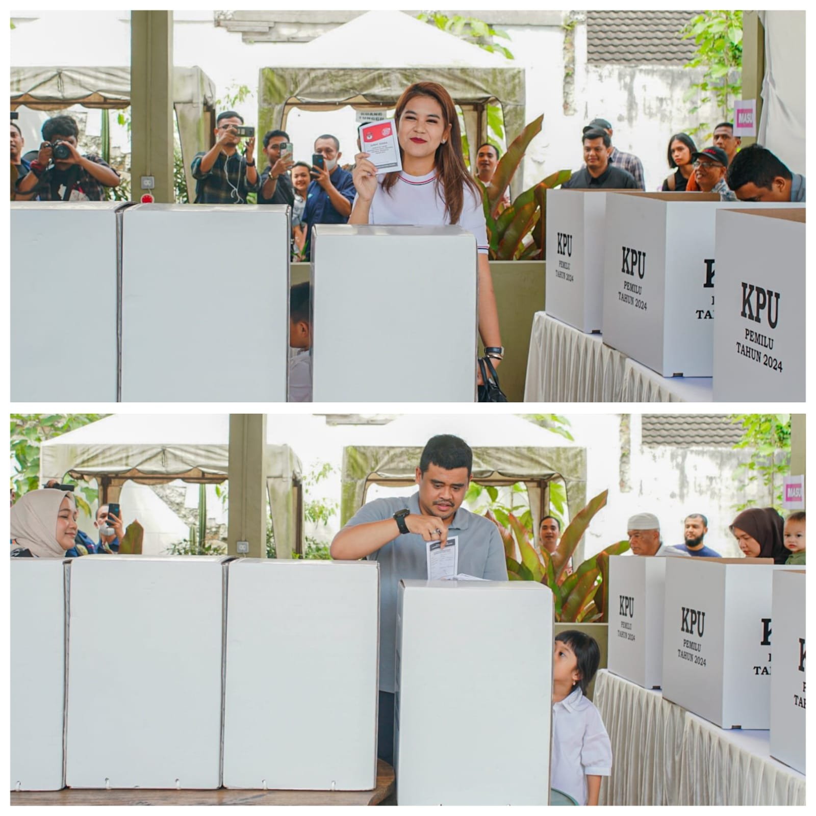 Kehadiran Bobby Nasution dan Kahiyang Ayu datang ke TPS bersama ibu, kakak, serta dua anaknya, yaitu Panembahan Al Nahyan Nasution dan Sedah Mirah.