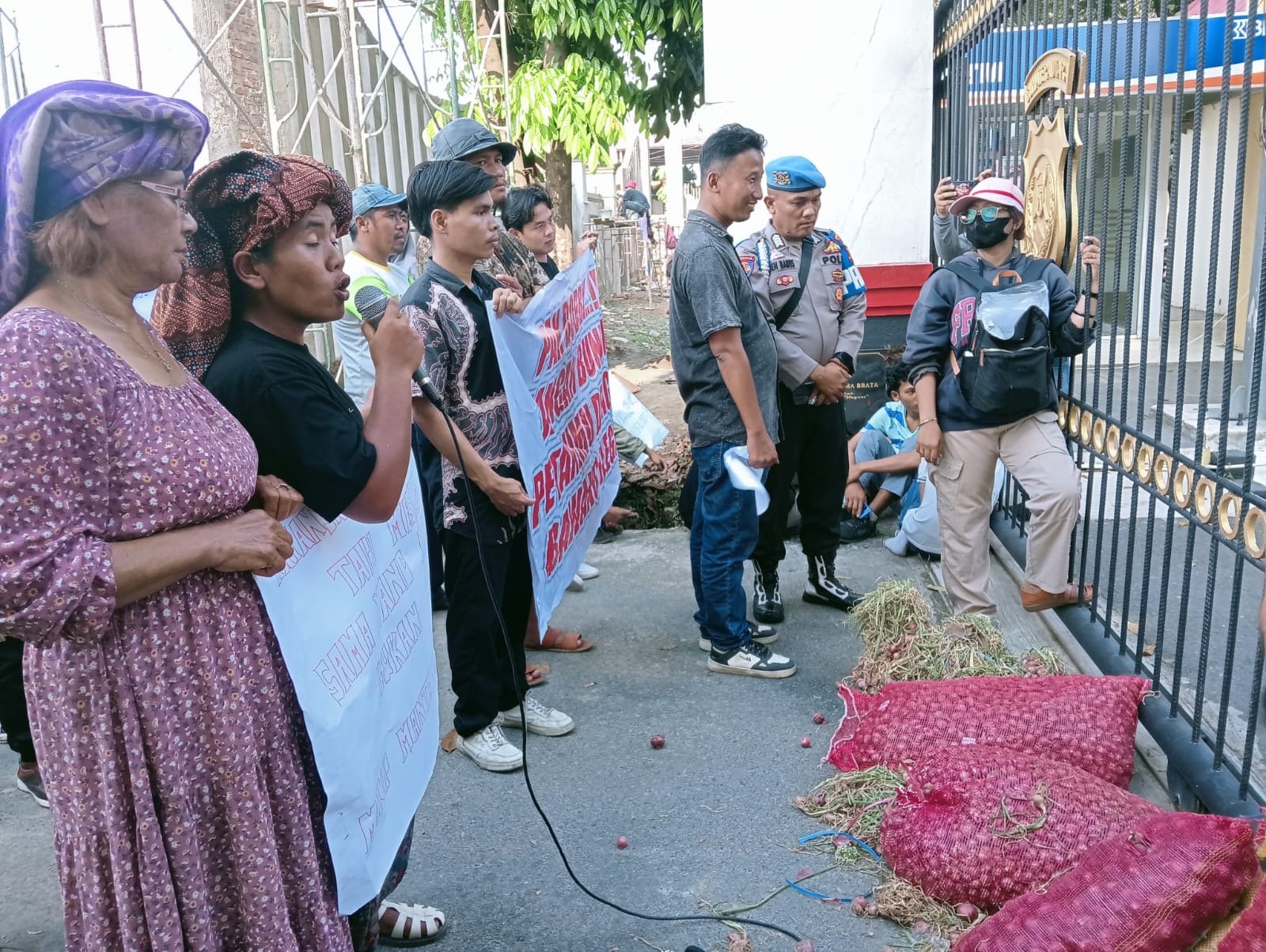 Dalam aksinya, para petani membawa enam karung berisi bawang ilegal serta sejumlah spanduk sebagai bentuk protes.