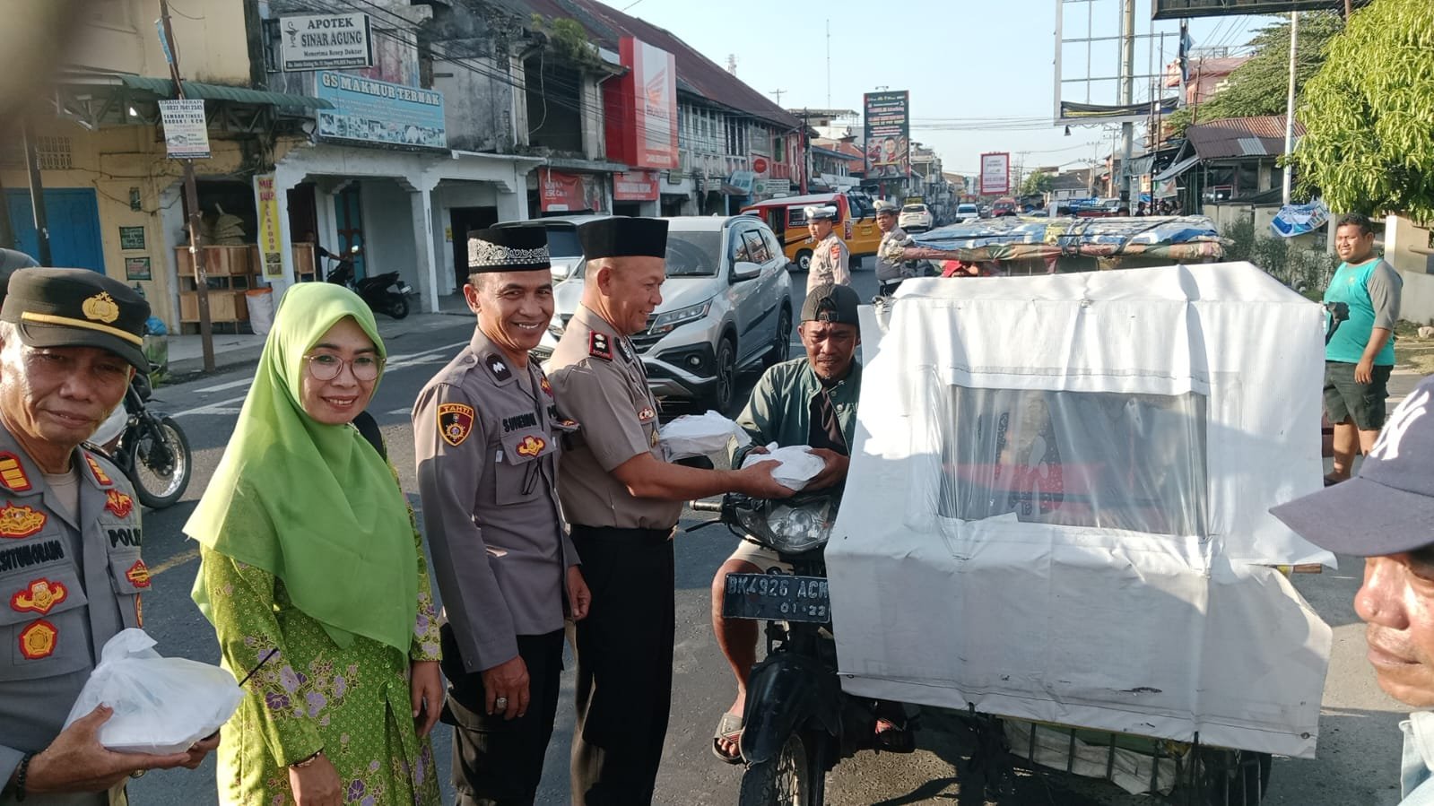 Kapolsek Pancur Batu Kompol Junaidi S.H , Ketua Ranting Bhayangkari Pancur Batu Ny Nova Junaidi , dan Ketua Pac Muslimatt NU ibu Darani Nasution hadir langsung dalam pembagian takjl kepada masyarakat yang melintas di depan Kantor Polsek Pancur Batu