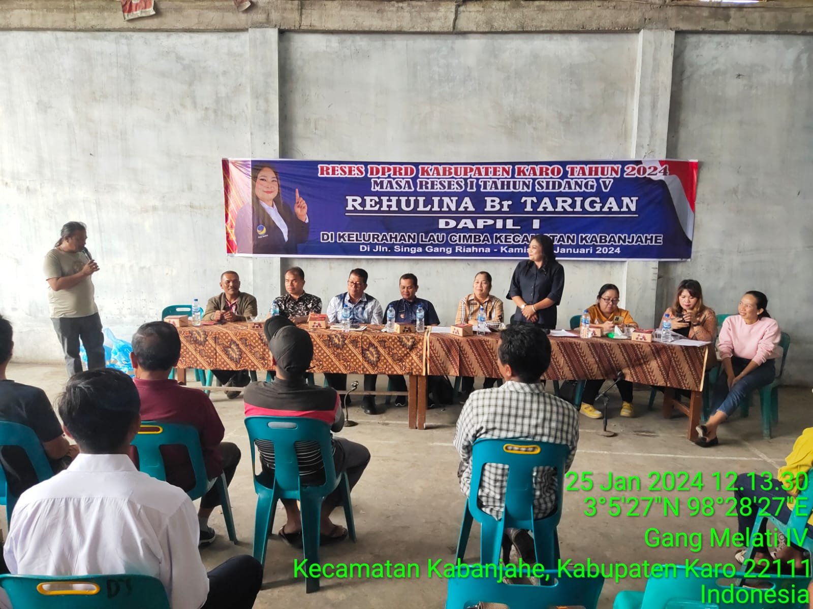 KARO (HARIANSTAR.COM) – Reses Anggota DPRD Kabupaten Karo Tahun 2024 Masa Reses I tahun V, Rehulina Br Tarigan Dapil 1 di Kelurahan Lau Cimba Kecamatan Kabanjahe Kabupaten Karo dilaksanakan di Jalan Singa Gang Riahna, Kamis (25/1/2024)