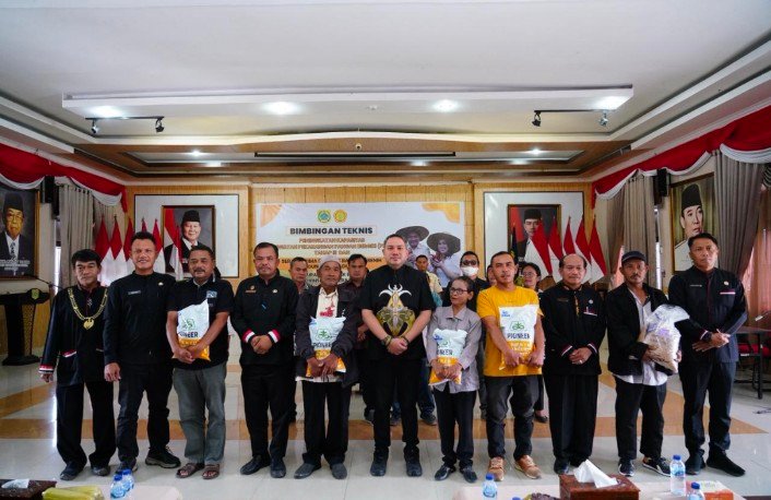 Franc menyerahkan bantuan berbagai bantuan ini di aula bale sada arih, bersamaan dengan bimbingan teknis peningkatan kapasitas kegiatan Pekarangan Pangan Bergizi (P2B) Jumat (14/11/2025).