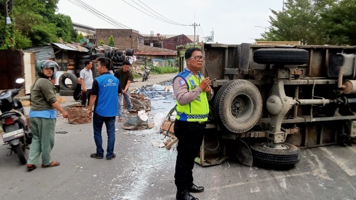 “Truk berangkat dari gudang di Jalan Medan–Binjai Km 12,5 Desa Sei Semayang menuju Perumahan Graha Metropolitan. Saat melintas di Jalan Kapten Sumarsono, ban belakang kiri truk pecah sehingga kendaraan oleng dan terbalik ke sisi kiri,” kata Jefriadi.