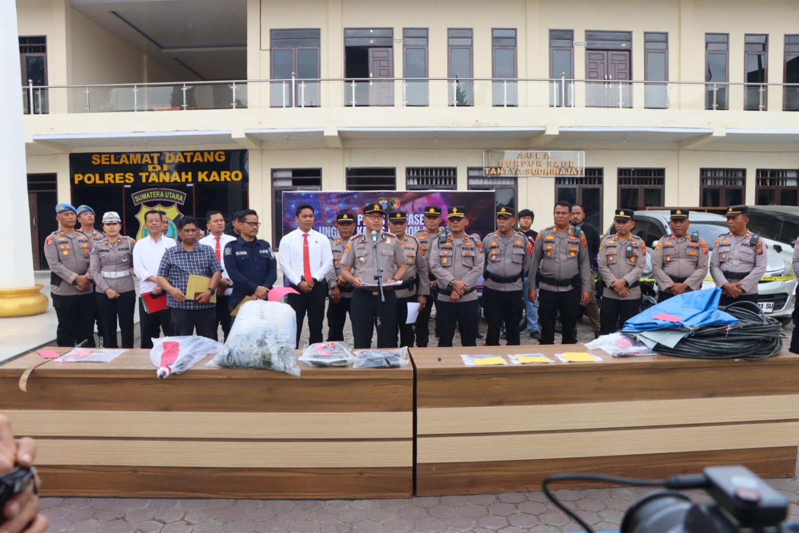 KARO (HARIANSTAR.COM) – Polres Tanah Karo menggelar press release pengungkapan sejumlah kasus menonjol sepanjang tahun 2025 hingga awal tahun 2026, Jumat (23/1) pukul 12.00 WIB. Kegiatan tersebut dipimpin langsung oleh Kapolres Tanah Karo AKBP Pebriandi Haloho, S.H, S.I.K, M. Si, didampingi para PJU dan Kapolsek jajaran, yang memaparkan capaian kinerja serta evaluasi penanganan kriminalitas di wilayah hukumnya.