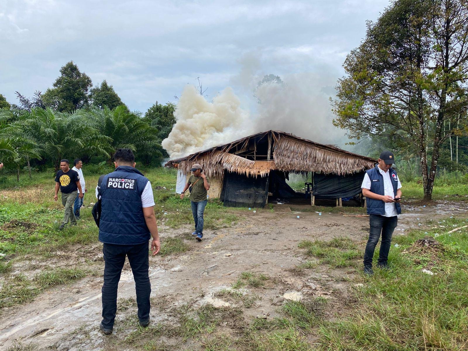 Polisi segera bertindak dengan membongkar dan membakar gubuk-gubuk yang dijadikan tempat penyalahgunaan narkoba, memastikan lokasi tersebut tidak dapat digunakan kembali.