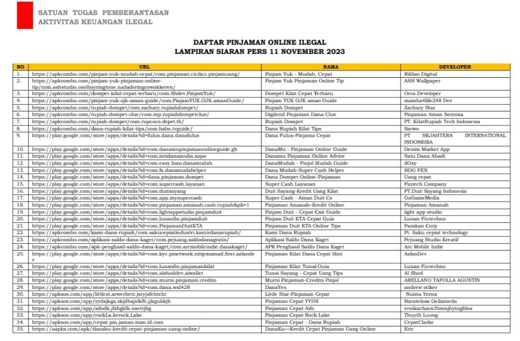 “Satgas PASTI kembali mengingatkan masyarakat untuk berhati-hati, waspada dan tidak menggunakan pinjaman online ilegal maupun pinjaman pribadi karena berpotensi merugikan masyarakat termasuk risiko penyalahgunaan data pribadi peminjam,” sebut Hudiyanto dalam rilisnya, Minggu (12/11/2023).