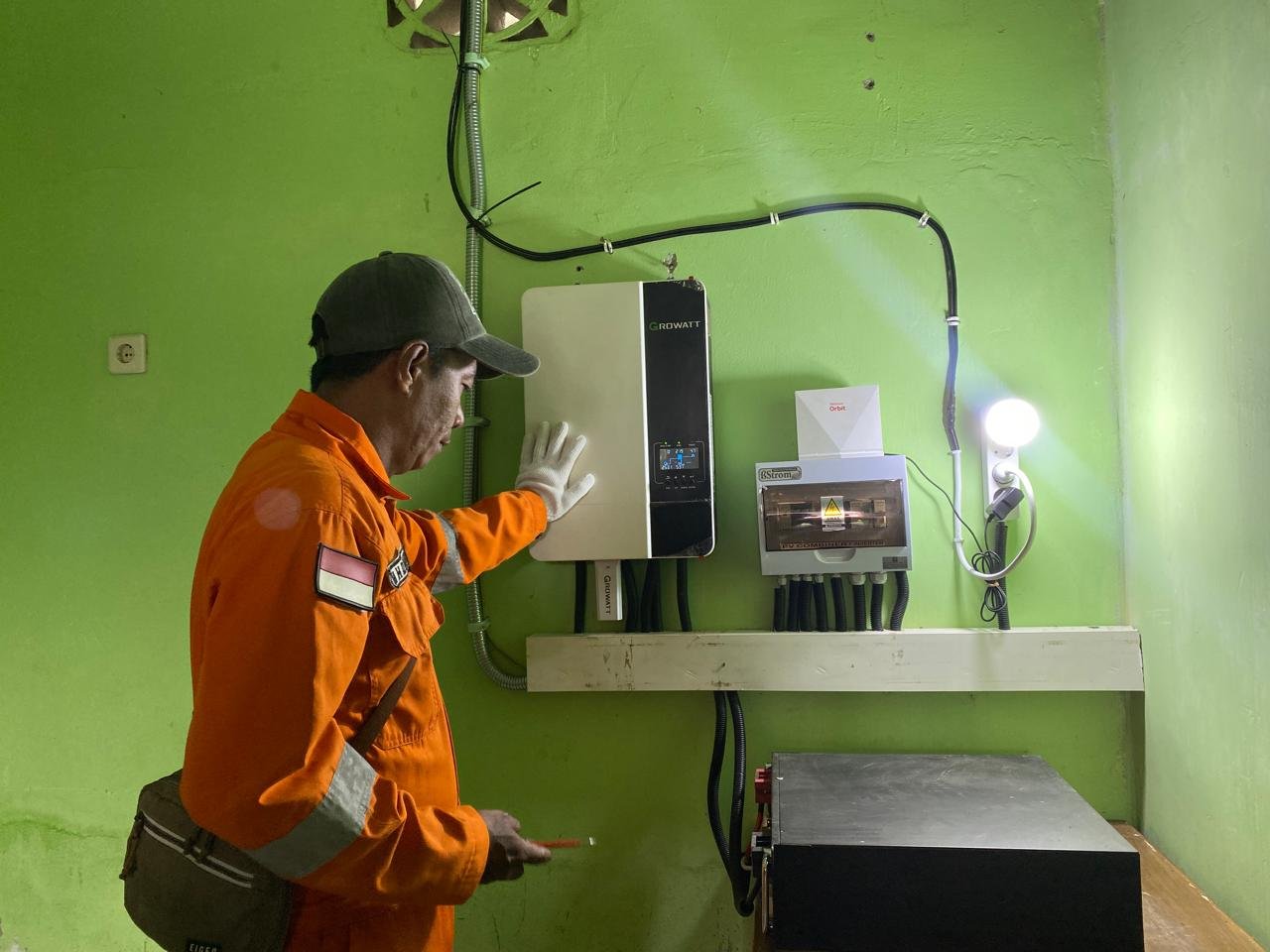 Pegawai PT Pertamina saat memantau produksi energi, konsumsi daya dan kinerja sistem PLTS di SLBN Pembina Tamiang. Foto: Puput Julianti Damanik