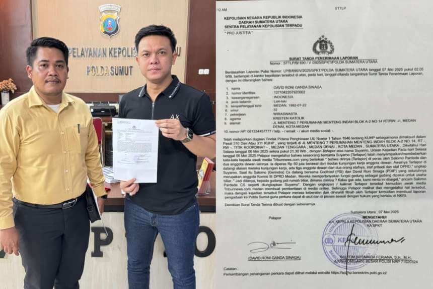 MEDAN – Merasa difitnah dengan tudingan pemerasan, anggota DPRD Kota Medan, David Roni G Sinaga, melaporkan pengusaha pemilik billiar Suyarno ke Polda Sumatera Utara (Poldasu), dengan nomor STTLP/B/690/V/2025/SPKT/Polda Sumatera Utara, Rabu (7/5) pukul 02.05 wib dinihari.