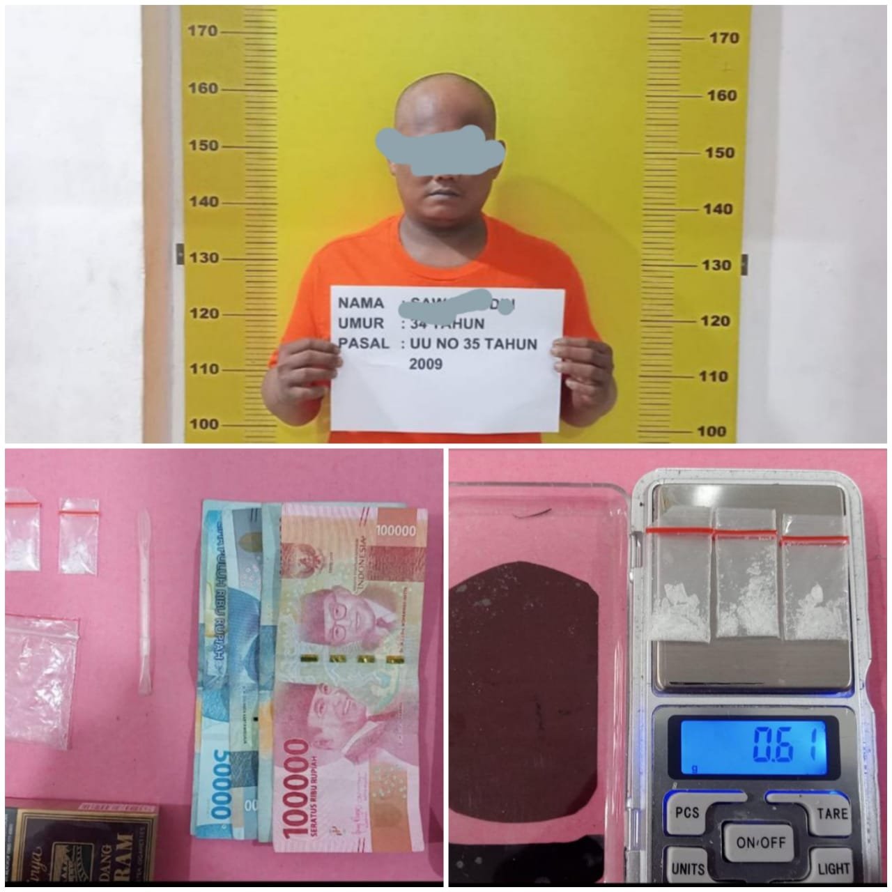 Hasilnya, ditemukan 1 kotak rokok terdapat 3 paket plastik klip diduga berisi sabu seberat 0,61 gram, 1 bungkus plastik klip kosong, 1 pipet skop, uang Rp300.000,-dan HP.