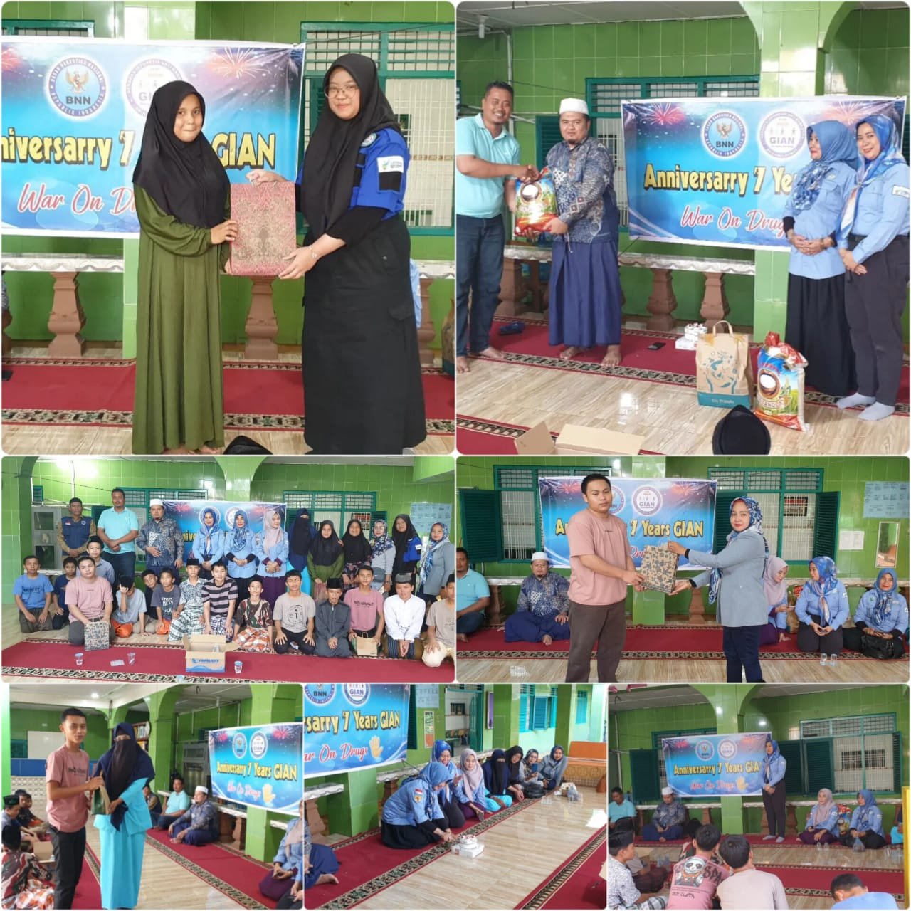 Selain pemotongan cake, sebagai rasa syukur, pengurus Srikandi GIAN memberikan bantuan berupa dana, sembako, makanan beku, dan beberapa hadiah kepada anak didik yang aktif menjawab pertanyaan seputar bahaya narkotika.