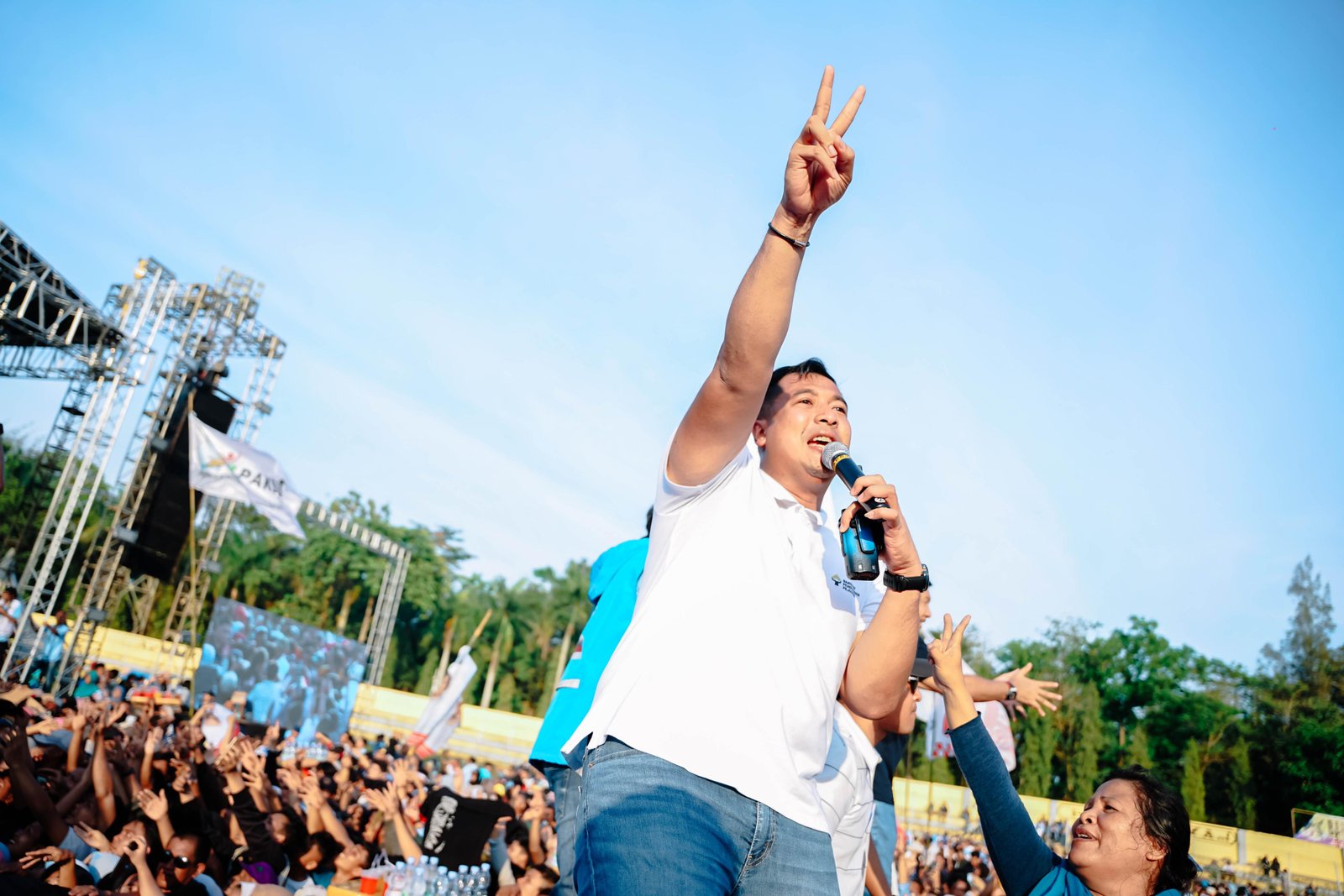 Ketua TKD Prabowo Gibran Sumut, Ade Jona Prasetyo  di Stadion Baharoeddin Siregar, Lubuk Pakam, Deli Serdang, Rabu (7/2/2024), saat berkampanye Capres - Cawapres no Urut 02 dalam konser musik Koalisi Indonesia Maju.