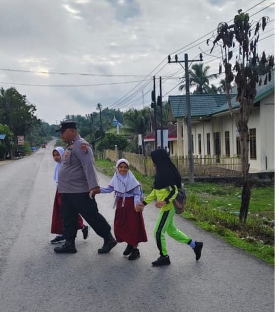 Personil Polsek Sosa yang melaksanakan tugas gatur lalin Aiptu PH. Pasaribu, S.H di Depan SDN 0401 CENTER Desa Pasar Ujung Batu, Kecamatan Sosa, Kabupaten Padang Lawas.