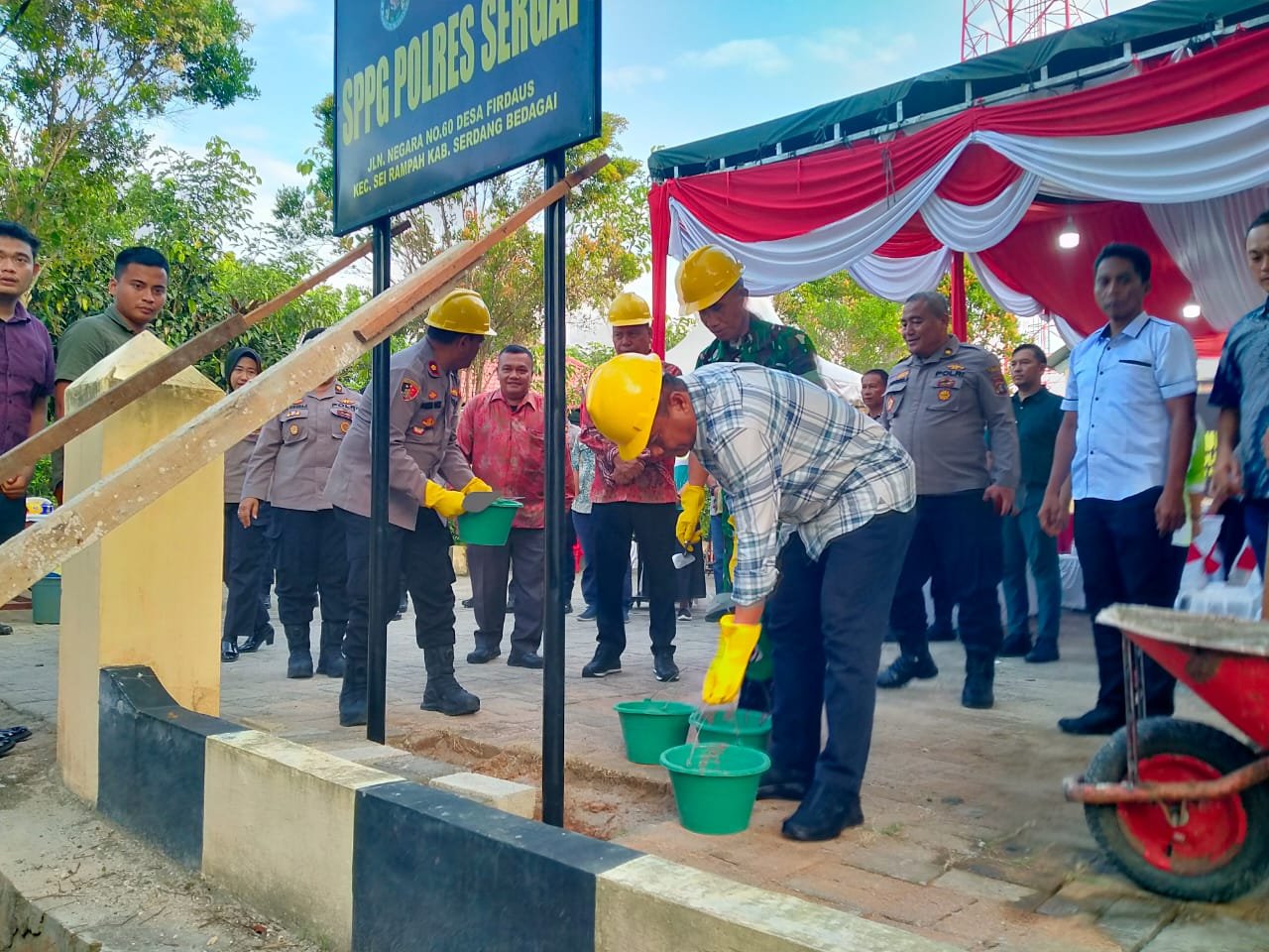 Usai mengikuti acara virtual,Bupati Sergai Darma Wijaya disertai Wakapolres Sergai Kompol Mukmin Rambe,Ketika PN Sei Rampah,M. Sacral Ritonga dan Pabung Kodim 0204/DS Mayor Inf Ponidi melakukan pemancangan Plang Gedung SPPG Polres Sergai.